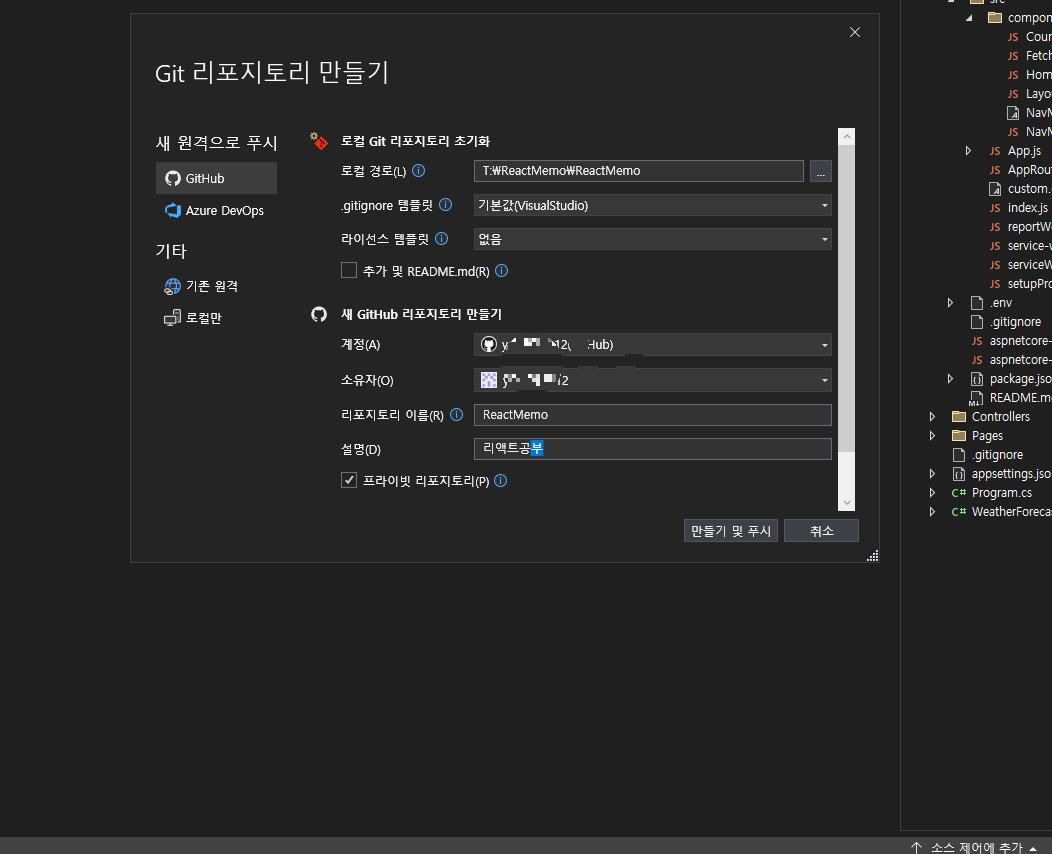 오른쪽아래 소스제어에 추가 클릭 -> Git 설정 -> 만들기 및 푸시