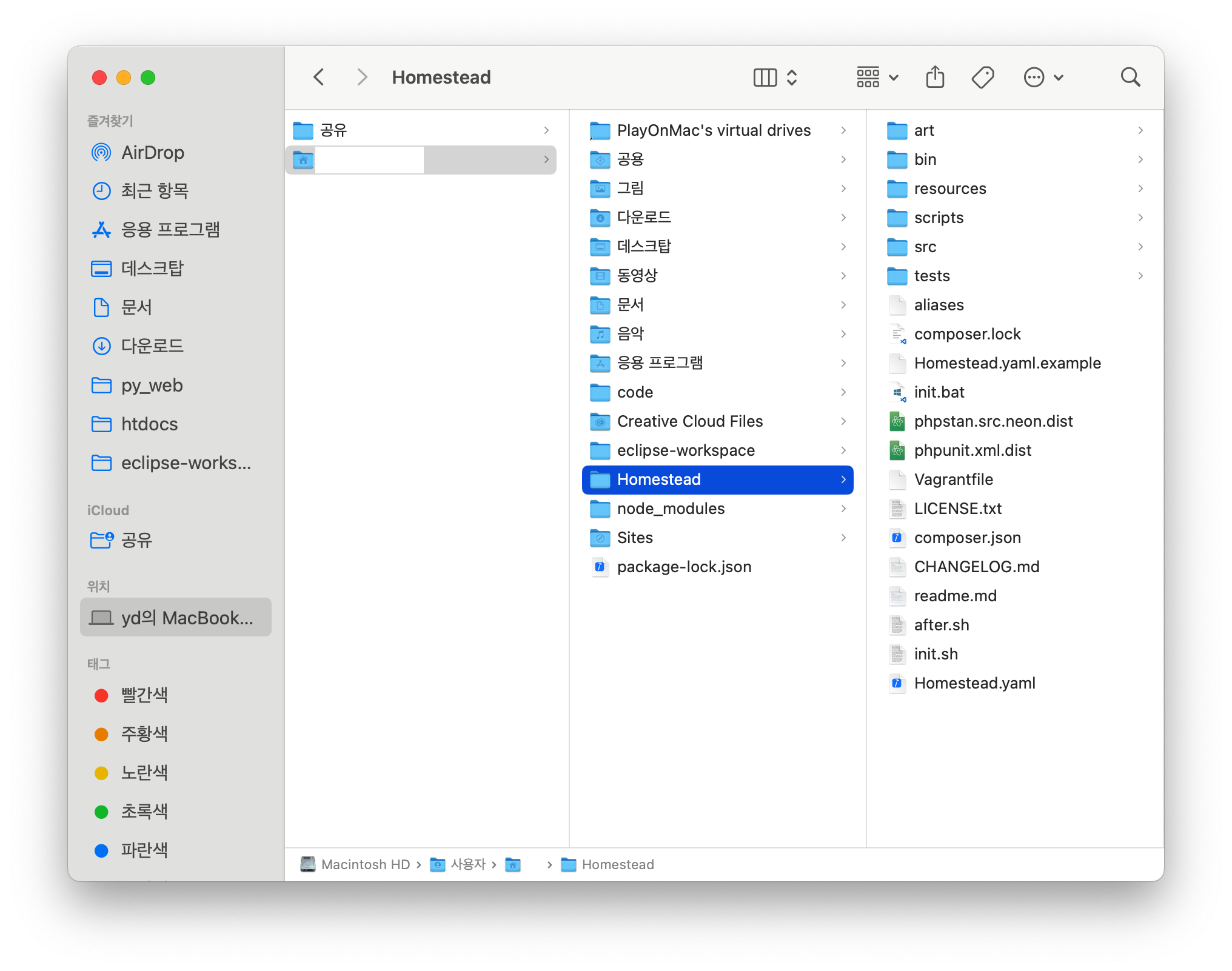 - Mac 기준 설치 경로(보통 하드디스크>사용자>맥북사용자이름>Homestead):