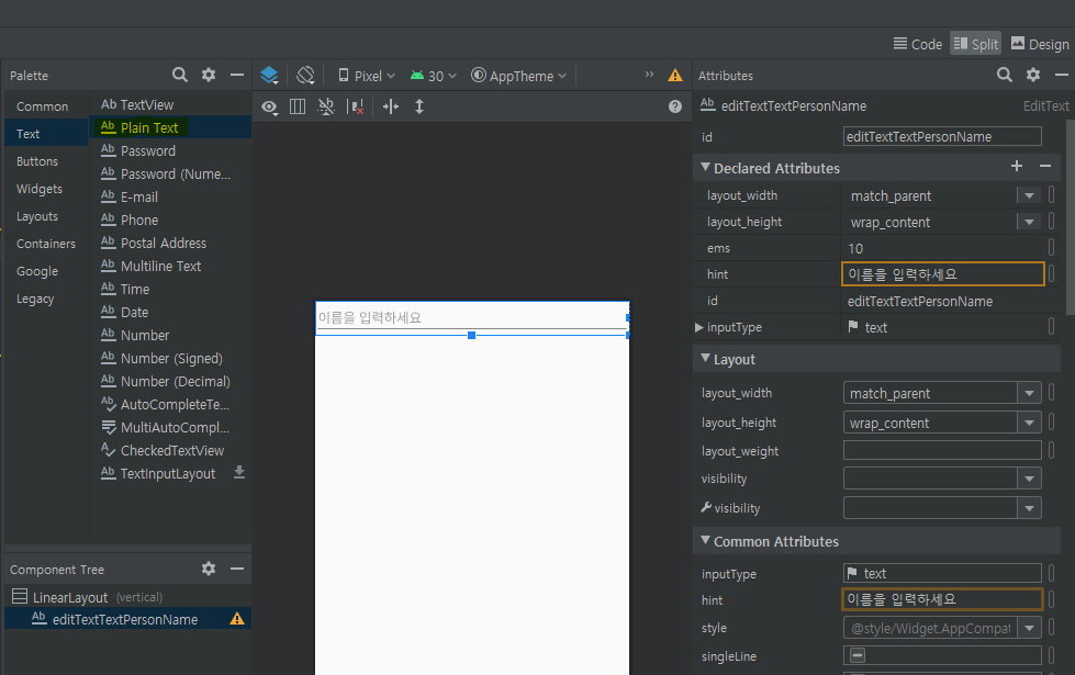 - 힌트 색상도 변경이 가능함 android:textColorHint=""