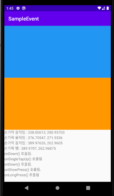 | onSingleTapUp() | 화면이 한 손가락으로 눌렀다 뗴어지는 경우 |