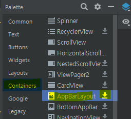 - activity_main.xml을 누르고 palette에서 Cintainers -> AppBarLayout 다운로드를 누르면