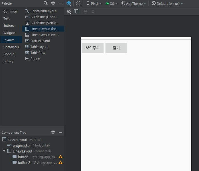 4. LinearLayout(Horizontal) 추가 버튼 두개 추가 보여주기 닫기 설정