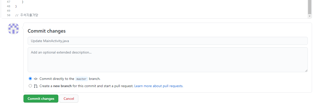 Add on optional 수정한 내용을 입력 Commit changes 버튼을 누른다.