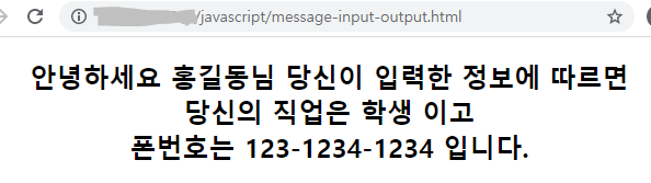 document.write("<h2>안녕하세요 " + name +"님 당신이 입력한 정보에 따르면<br>당신의 직업은 " + job + " 이고<br>폰번호는 " + phonenum + " 입니다.</h2>" )