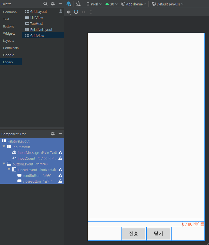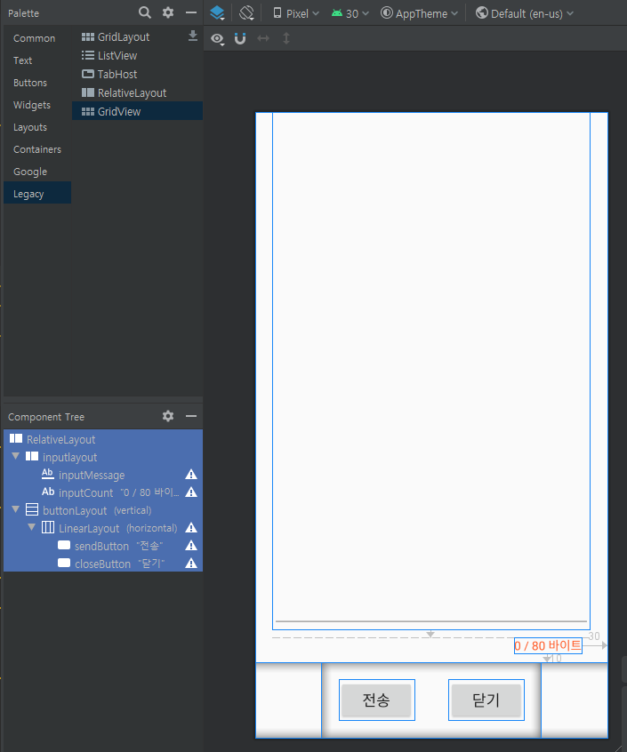 - 첫번째 RelativeLayout은 layout_above 속성으로 2번째 LinearLayout (id = buttonLayout)보다 위에 있게 설정