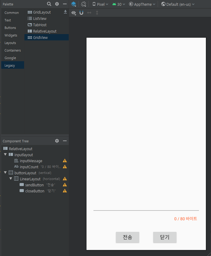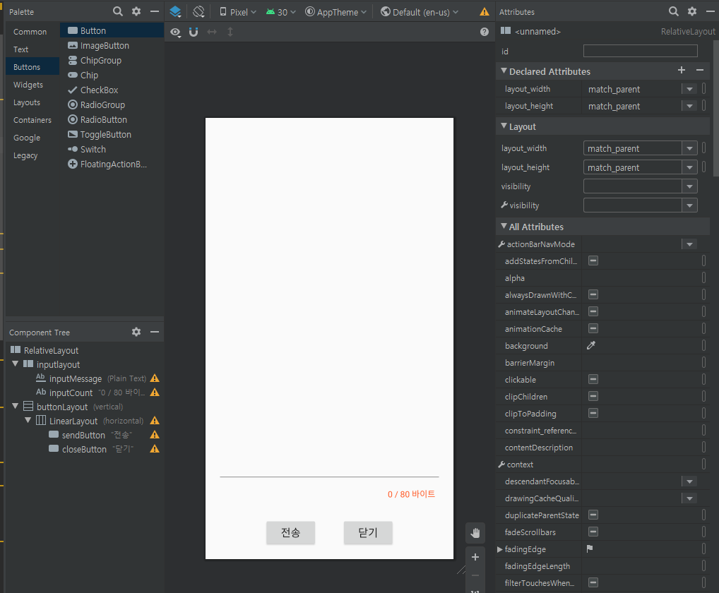 - 버튼 레이아웃은 LinearLayout 두개로 정렬을 해준다 vertical, horizontal가로정령세로정렬해준다