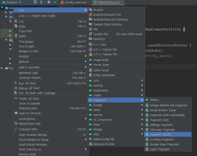 - 프로젝트 목록화면에서 app에서 우클릭 New -> Fragment -> Fragment (Blank)