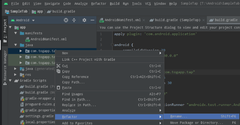 최상위 SampleTap을 SampleTab으로 변경하려고하는데 그냥 화면에서는 안된다