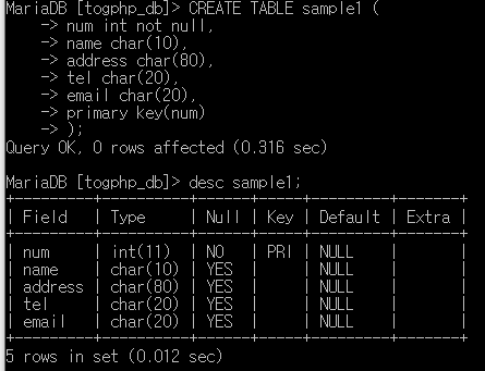 MariaDB [togphp_db]> CREATE TABLE sample1 (