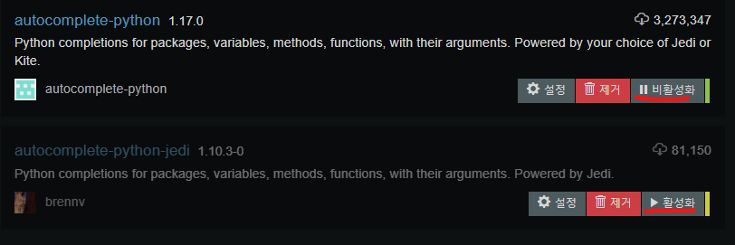 아톰 설정에서 패키지로 들어가고 autocomplete-python-jedi 설치한 후 autocomplete-python 패키지를 비활성화 하고