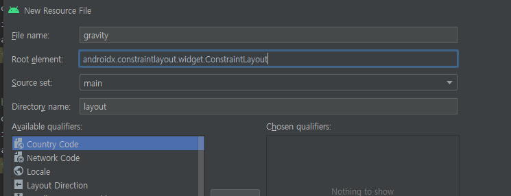 /app/res/layout 마우스 오른쪽 New-> Layout resource file 클릭 file 이름 정해서 입력