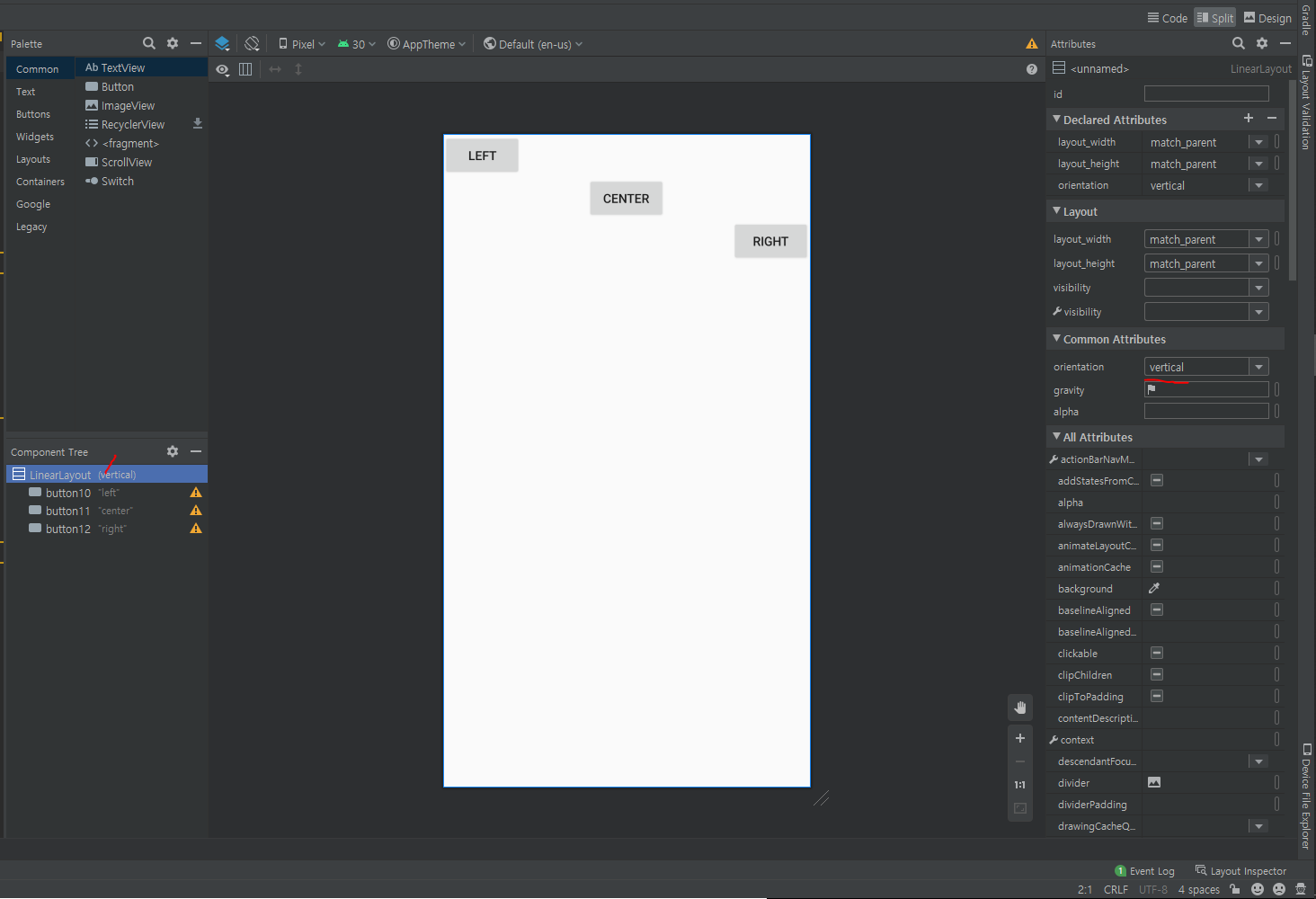 component tree에서 뷰전체를 선택해서 뷰의 방향 orientation 선택