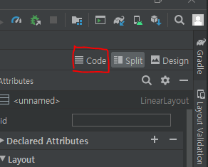 먼저 새 layout 파일 만들어서 속성 적용으로 어떻게 정렬되는지 확인했음 code 코드를 직접쓰는거와 split으로 코드보면서 화면보면서 하는 방법으로 하면될거같다 Design으로 코드 안보고 추가해도 되지만 code는 확인 하고 넘어가야함