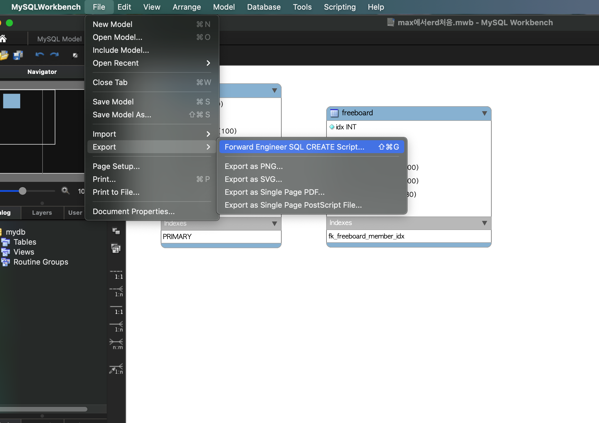 우리(???)의 목적은 쿼리작성이 아니고 ERD였으니 좌측 메뉴에 2번째 메뉴를 선택한다 (ERD 아는 사람이면 좌측 메뉴보면 관계도 네모박스 보면 바로안다)