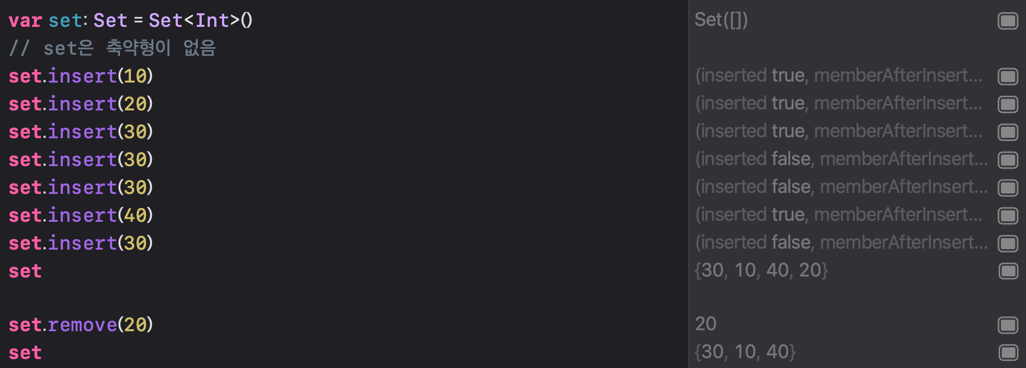 ● Set 형태로 저장되기 위해서는 반드시 타입이 hashable 이어야만 합니다. Swift에서는 String, Int, Double, Bool 같은 기본 타입은 기본적으로 hashable 입니다.
