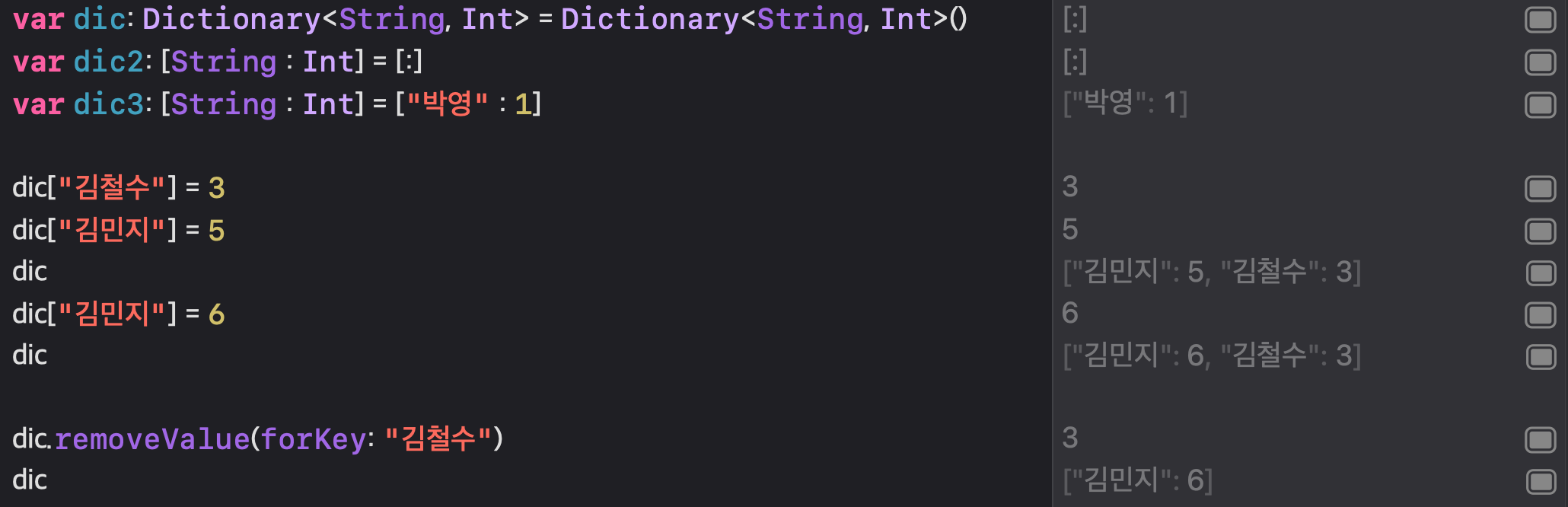 ● 딕셔너리를 변수(var)에 할당하면 항상 변경 가능하며, 상수(let)에 할당하면 변경할 수 없습니다.