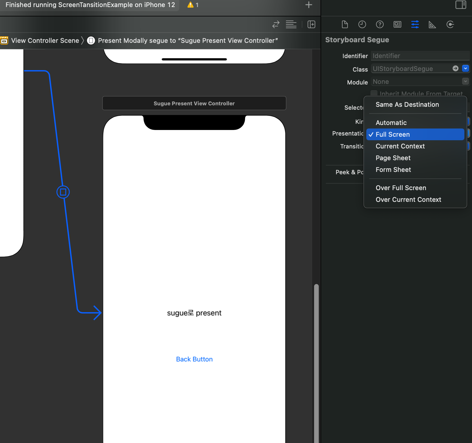 Presentation은 풀스크린이 아닌데 아래처럼 속성을 변경해주면 풀스크린이 된다